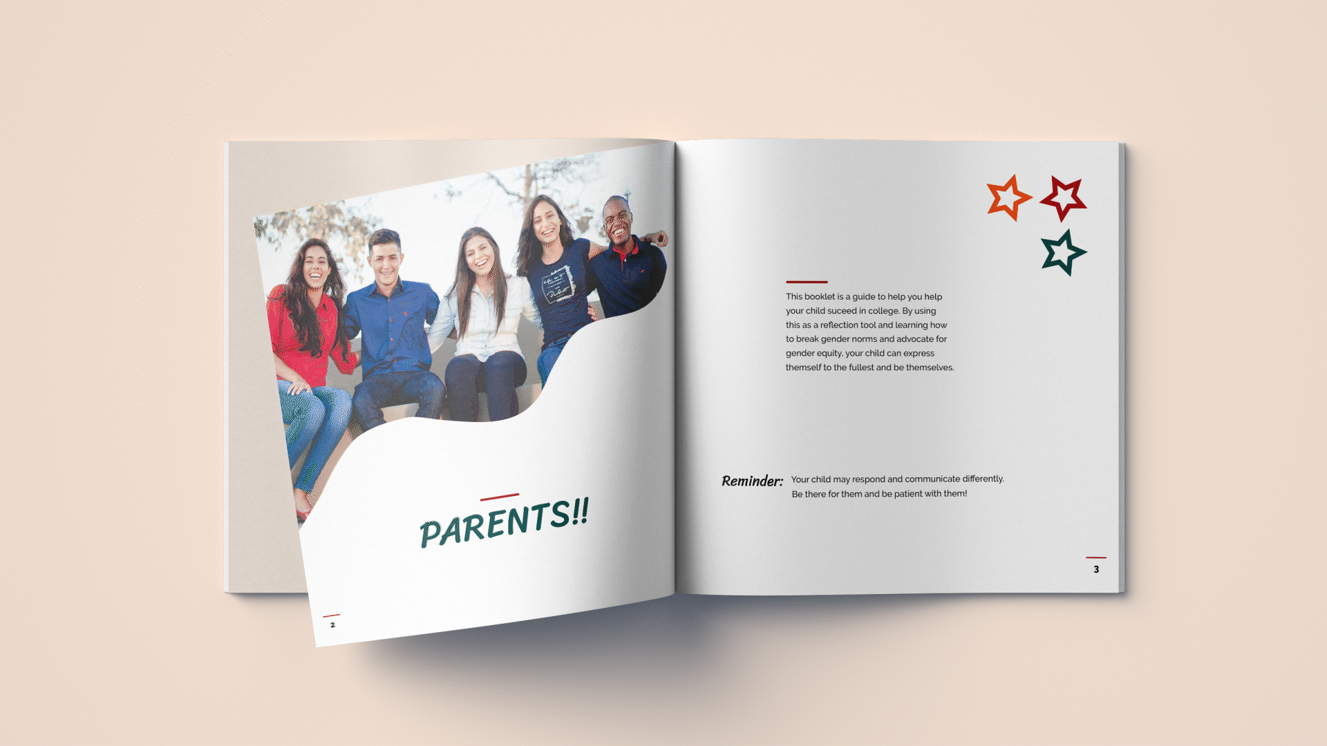 Deployed and assigned during family orientation, this booklet is a guide to assist parents to support their child in succeeding in college. Parents would use this booklet as a reflection tool. By learning how to break gender norms and advocating for gender equity, their child can express themself to the fullest and be themselves.