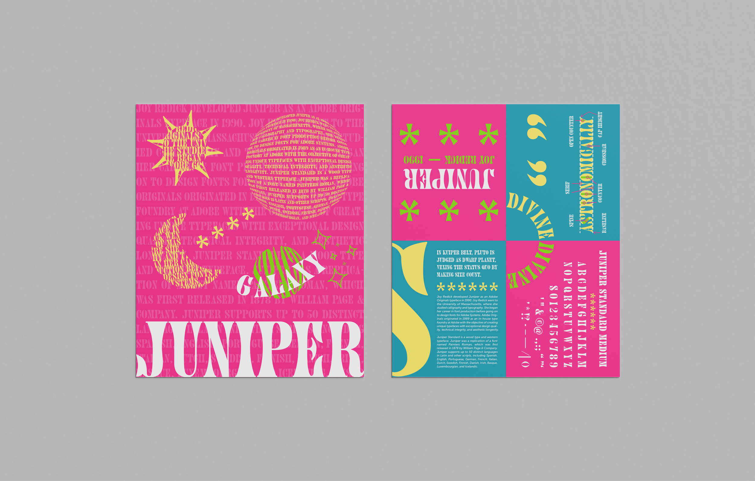 I developed a Type Specimen Sheet for the typeface Juniper by Joy Redick in 1990. I designed it in the theme of space due to the visual attributes of the typeface. On the front cover, I highlighted the anatomy, weights, characters, panagram and history, while on the back cover, the space theme was visually designed with typography.